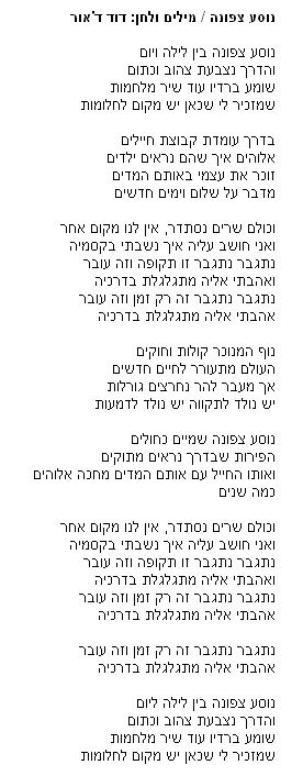 Ich fahre nach den Norden zwischen Nacht und Tag Und der Weg färbt sich gelb und orange. Ich höre im Radio noch ein Kriegeslied, der mich daran erinnert dass hier noch Platz für Träume gibt. Entlang der Strasse steht eine Gruppe von Soldaten, Gott! Sie sehen noch wie Kinder aus, Ich kann mich noch in den gleichen Uniform sehen, über den Frieden sprechend, und über neue Zeiten. Und alle Singen: „Wir kommen schon zurecht, wir haben kein anderen Platz, und ich denke an Ihr, wie ich in ihrem Zauber fiel, Wir werden schon zurechtkommen, es ist nur eine Phase, die vorüber sein wird, Meine Liebe zu Ihr nimmt ihren Weg, Wir werden schon zurechtkommen, es ist nur eine Phase, die vorüber sein wird, Meine Liebe zu Ihr nimmt ihren Weg Eine entfremdete Landschaft, Stimmen und Gesetze, Zu neuem Leben erwacht die Welt, Über den Berg, jedoch, werden Schicksale entschieden, Einer wird zu Hoffnung geboren, einer zu Tränen. Ich fahre nach Norden, der Himmel ist blau, die Früchte entlang des Weges scheinen süß zu sein, und der gleiche Soldat mit den selben Uniformen wartet: mein Gott! Wie viele Jahren schon... Und alle Singen: „Wir kommen schon zurecht, wir haben kein anderen Platz, und ich denke an Ihr, wie ich in ihrem Zauber fiel, Wir werden schon zurechtkommen, es ist nur eine Phase, die vorüber sein wird, Meine Liebe zu Ihr nimmt ihren Weg, Wir werden schon zurechtkommen, es ist nur eine Phase, die vorüber sein wird, Meine Liebe zu Ihr nimmt ihren Weg Ich fahre nach dem Norden zwischen Nacht und Tag Und der Weg färbt sich gelb und orange. Ich höre im Radio noch ein Kriegeslied, der mich daran erinnert dass hier noch Platz für Träume gibt.